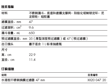 通过真空过滤进行颗粒或生物污染物分析。 包含配合易燃液体使用时的接地装置。 装有滤膜时,该换膜过滤器不可高温高压灭菌。